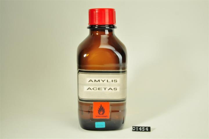 Braune Vierkantflasche mit Weithals und rotem Schraubverschluss. Mit Dymo-Drucker beschriftetes und mit Klarsichtfolie überzogenes Papierschild, achteckig, mit schwarzem Doppelrand und schwarzer Schrift auf ehemals weißem Grund. Darunter rotes Warnschild mit schwarz aufgedrucktem Flammensymbol. Im Dezember 1991 aus dem Sortiment genommen (blaues Schild).