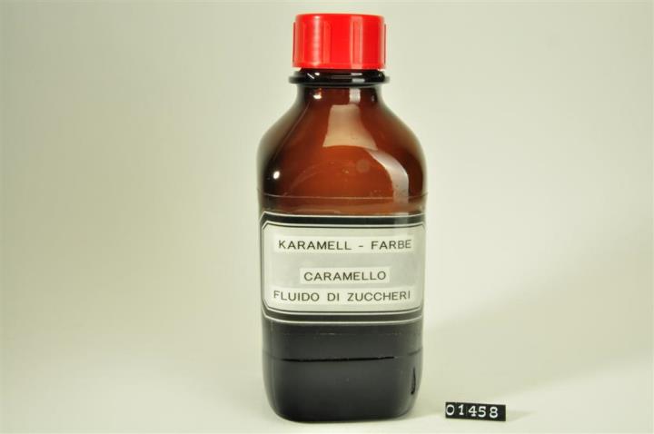 Braune Vierkantflasche mit Weithals und rotem Schraubverschluss. Mit Dymo-Band beschriftetes und mit Klarsichtfolie überzogenes Papierschild, achteckig, mit schwarzem Doppelrand und schwarzer Schrift auf weißem Grund.