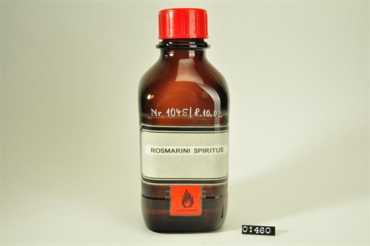 Braune Vierkantflasche mit Weithals und rotem Schraubverschluss. Mit Dymo-Band beschriftetes und mit Klarsichtfolie überzogenes Papierschild, achteckig, mit schwarzem Doppelrand und schwarzer Schrift auf weißem Grund. Darunter rotes Warnschild mit schwarz aufgedrucktem Flammensymbol. Mit weißem Filzstift Chargennummer am oberen Rand (Charge 1045 vom 08. Oktober 2002). Beschriftet von Lioba Sperber.