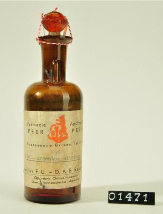 Runde, braune Tropfflasche mit Ausguss und Stopfen (Massivstopfen mit kugelförmigem Griff mit Kerbe). Mit Rezepturfaden Stopfen gesichert. Verdickter, abgeflachter Mündungsrand. Signiert mit Schreibmaschine von Ignaz Peer II auf Apothekenetikett.