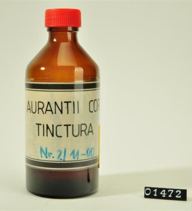 Braune Enghalsflasche (EURO Med-Flasche) mit rotem Schraubverschluss. Mit Abreibe-Buchstaben beschriftetes und mit Klarsichtfolie überzogenes Papierschild, achteckig, mit schwarzem Doppelrand und schwarzer Schrift auf weißem Grund. Mit blauem Filzstift Chargennummer am unteren Rand (Charge 2 vom November 2000). Beschriftet von Lioba Sperber.