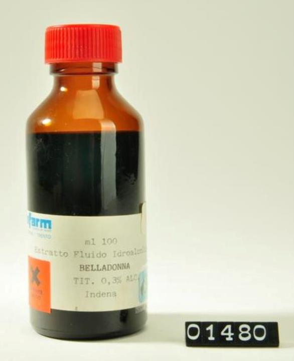 Braune Enghalsflasche (EURO Med-Flasche) mit rotem Schraubverschluss. Signiert. Etikett der Unifarm, Trento. Seitlich rotes Warnschild mit schwarz aufgedrucktem Kreuz.