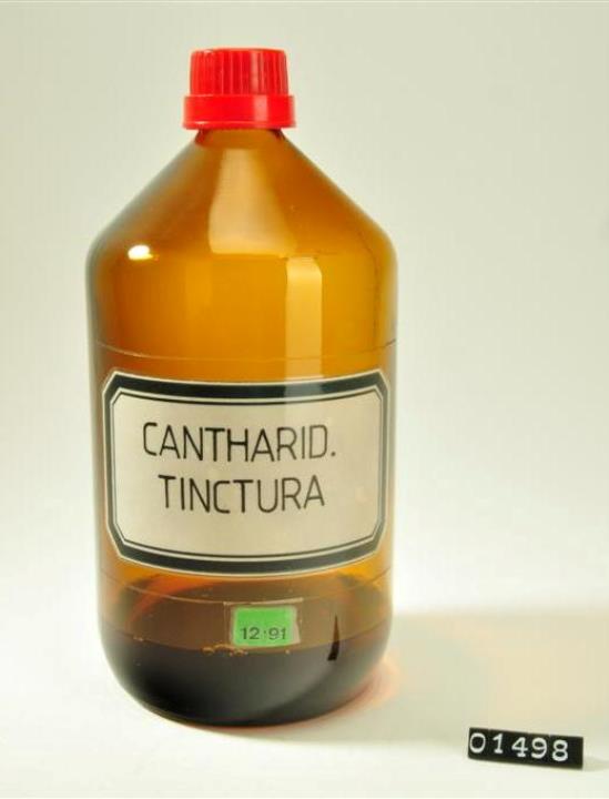 Braune Enghalsflasche mit rotem Schraubverschluss. Mit Schablone beschriftetes und mit Klarsichtfolie überzogenes Papierschild, achteckig, mit schwarzem Doppelrand und schwarzer Schrift auf weißem Grund. Im Dezember 1991 aus dem Sortiment genommen (grünes Schild).