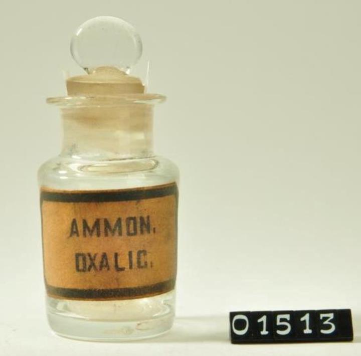 Rundes, farbloses Pulverglas mit Schliffstopfen mit scheibenförmigem Griff. Boden und Hohlstopfen mit Hefteisenabriss. Ausladender, abgeflachter Mündungsrand. Mit Signierapparat bedrucktes Papierschild, achteckig, mit schwarzem Rand und schwarzer Schrift auf ehemals weißem Grund. Mit Schilderlack überzogen.