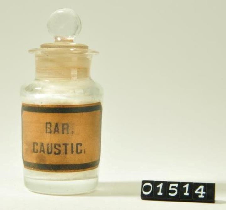 Rundes, farbloses Pulverglas mit Schliffstopfen mit scheibenförmigem Griff. Boden und Hohlstopfen mit Hefteisenabriss. Ausladender, abgeflachter Mündungsrand. Mit Signierapparat bedrucktes Papierschild, achteckig, mit schwarzem Rand und schwarzer Schrift auf ehemals weißem Grund. Mit Schilderlack überzogen.