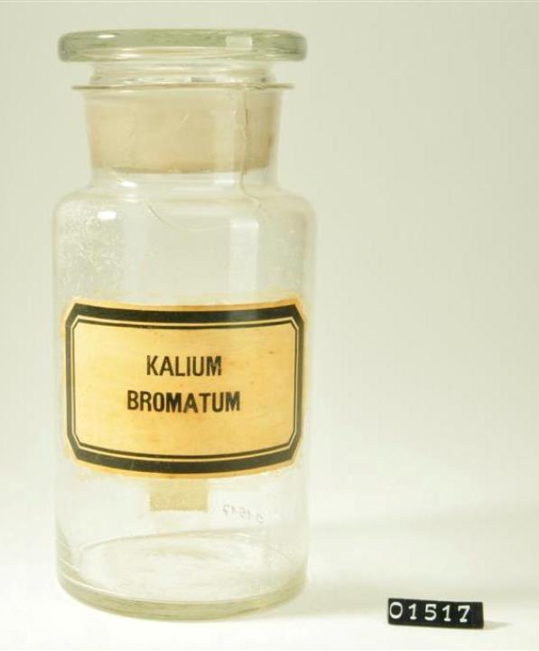 Rundes, farbloses Pulverglas mit Schliffstopfen. Hohlstopfen mit Hefteisenabriss. Ausladender, abgeflachter Mündungsrand. Mit Signierapparat bedrucktes Papierschild, achteckig, mit schwarzem Rand und schwarzer Schrift auf ehemals weißem Grund. Mit Schilderlack überzogen.