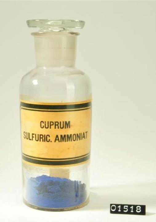 Rundes, farbloses Pulverglas mit Schliffstopfen. Hohlstopfen mit Hefteisenabriss. Ausladender, abgeflachter Mündungsrand. Mit Signierapparat bedrucktes Papierschild, achteckig, mit schwarzem Rand und schwarzer Schrift auf ehemals weißem Grund. Mit Schilderlack überzogen.