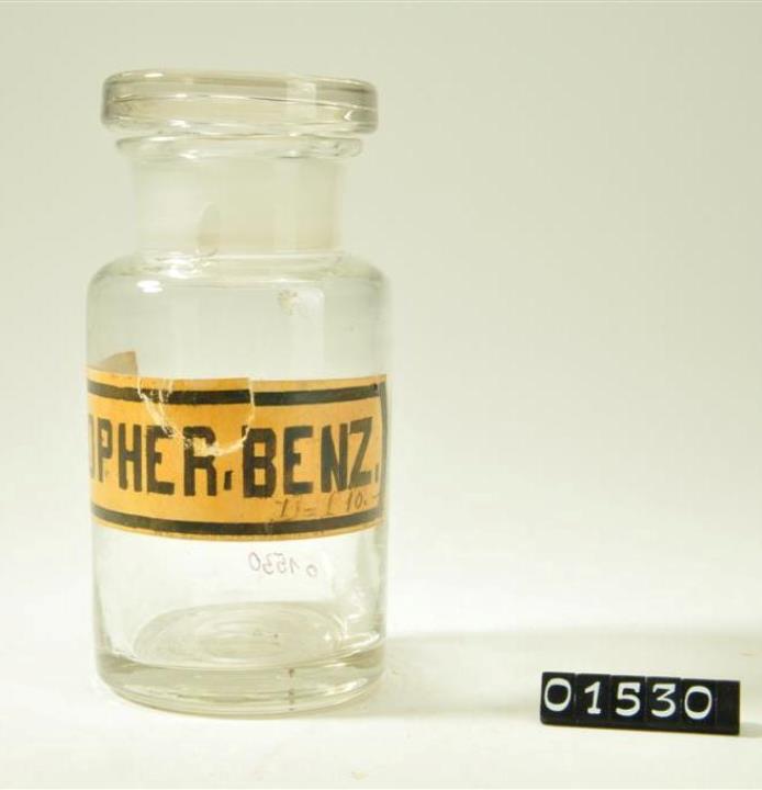 Rundes, farbloses Pulverglas mit Schliffstopfen. Hohlstopfen mit Hefteisenabriss. Ausladender, abgeflachter Mündungsrand. Mit Signierapparat bedrucktes Papierschild, achteckig, mit schwarzem Rand und schwarzer Schrift auf ehemals weißem Grund. Mit Schilderlack überzogen.