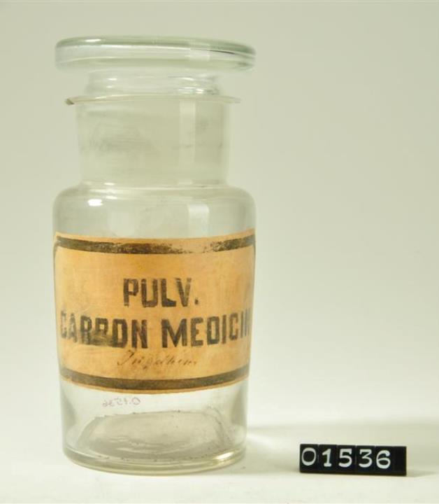 Rundes, farbloses Pulverglas mit Schliffstopfen. Hohlstopfen mit Hefteisenabriss. Verdickter, abgeflachter Mündungsrand. Mit Signierapparat bedrucktes Papierschild, achteckig, mit schwarzem Rand und schwarzer Schrift auf ehemals weißem Grund. Mit Schilderlack überzogen.