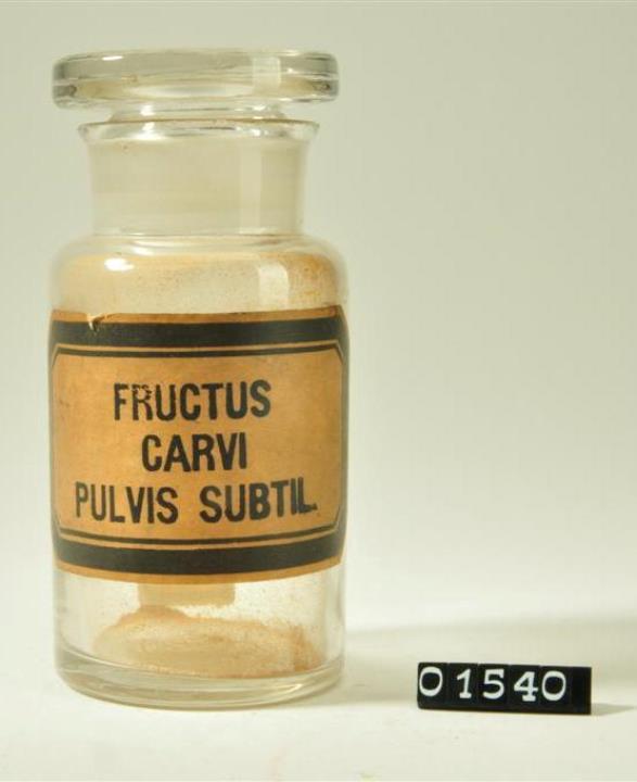Rundes, farbloses Pulverglas mit Schliffstopfen. Hohlstopfen mit Hefteisenabriss. Ausladender Mündungsrand. Mit Signierapparat bedrucktes Papierschild, achteckig, mit schwarzem Doppelrand und schwarzer Schrift auf ehemals weißem Grund. Mit Schilderlack überzogen.