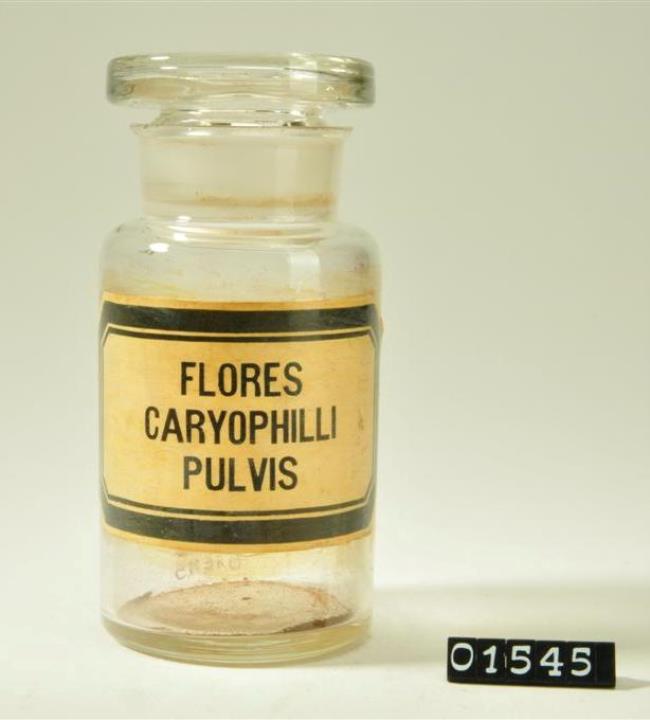 Rundes, farbloses Pulverglas mit Schliffstopfen. Hohlstopfen mit Hefteisenabriss. Ausladender Mündungsrand. Mit Signierapparat bedrucktes Papierschild, achteckig, mit schwarzem Doppelrand und schwarzer Schrift auf ehemals weißem Grund. Mit Schilderlack überzogen. Enthält Gewürznelkenpulver.