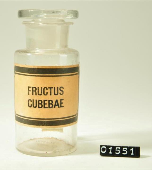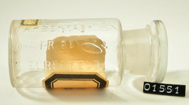 Rundes, farbloses Pulverglas mit Schliffstopfen. Hohlstopfen mit Hefteisenabriss. Verstärkter, abgeflachter Mündungsrand. Mit Signierapparat bedrucktes Papierschild, achteckig, mit schwarzem Doppelrand und schwarzer Schrift auf ehemals weißem Grund. Mit Schilderlack überzogen.