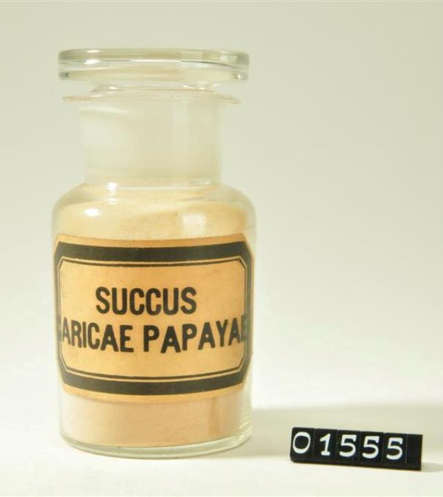Rundes, farbloses Pulverglas mit Schliffstopfen. Hohlstopfen mit Hefteisenabriss. Ausladender, flacher Mündungsrand. Mit Signierapparat bedrucktes Papierschild, achteckig, mit schwarzem Doppelrand und schwarzer Schrift auf ehemals weißem Grund. Mit Schilderlack überzogen.