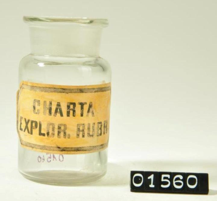 Rundes, farbloses Pulverglas ohne Schliffstopfen. Ausladender, flacher Mündungsrand. Mit Signierapparat bedrucktes Papierschild, achteckig, mit schwarzem Rand und schwarzer Schrift auf ehemals weißem Grund. Mit Schilderlack überzogen.