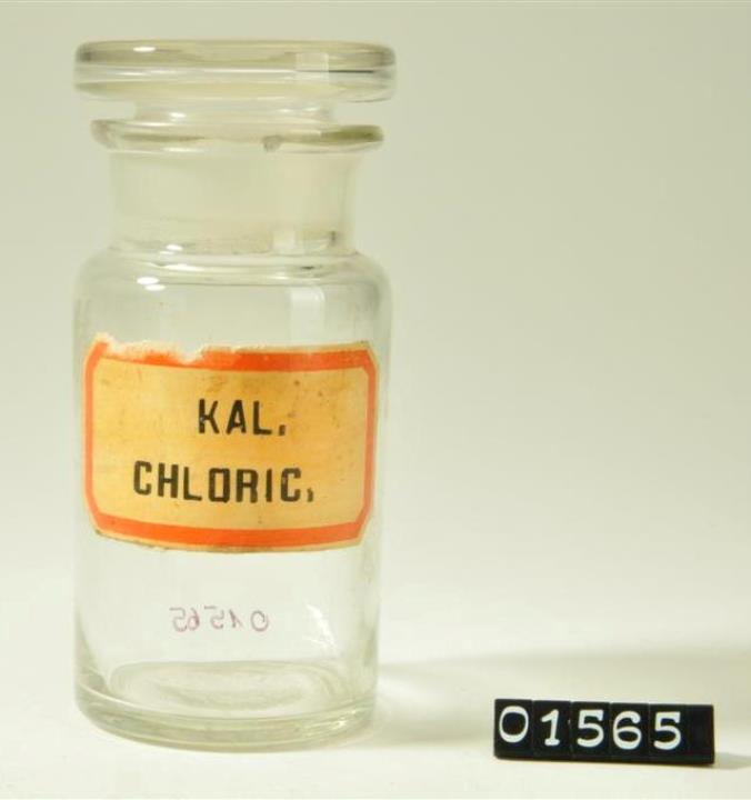 Rundes, farbloses Pulverglas mit Schliffstopfen. Hohlstopfen mit Hefteisenabriss. Verdickter, abgeflachter Mündungsrand. Mit Signierapparat bedrucktes Papierschild, achteckig, mit rotem Rand und schwarzer Schrift auf ehemals weißem Grund. Mit Schilderlack überzogen.