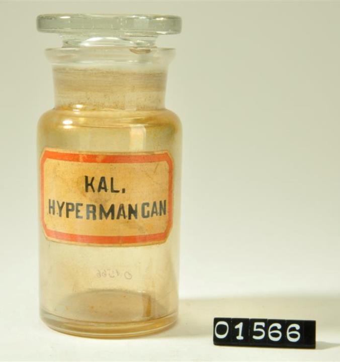 Rundes, farbloses Pulverglas mit Schliffstopfen. Hohlstopfen mit Hefteisenabriss. Verdickter, ausladender Mündungsrand. Mit Signierapparat bedrucktes Papierschild, achteckig, mit rotem Rand und schwarzer Schrift auf ehemals weißem Grund. Mit Schilderlack überzogen.