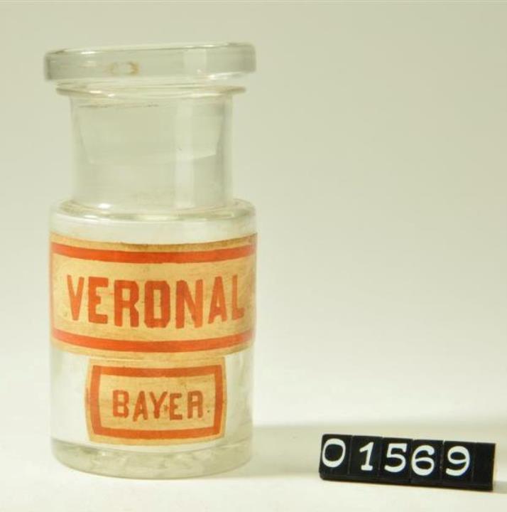 Rundes, farbloses Pulverglas mit Schliffstopfen. Hohlstopfen mit Hefteisenabriss. Verdickter, ausladender Mündungsrand. Mit Signierapparat bedrucktes Papierschild, rechteckig, mit rotem Rand und schwarzer Schrift auf ehemals weißem Grund. Mit Schilderlack überzogen.