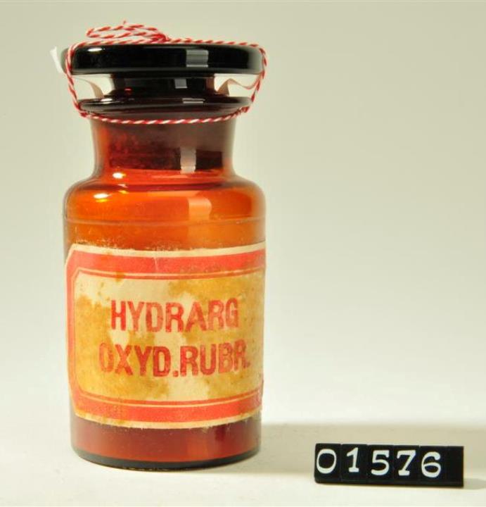 Rundes, braunes Pulverglas mit Schliffstopfen, mit rotweißem Rezepturfaden gesichert. Hohlstopfen mit Hefteisenabriss. Abgeflachter Mündungsrand. Mit Signierapparat bedrucktes und mit Schilderlack überzogenes Papierschild, achteckig, mit rotem Doppelrand und roter Schrift auf weißem Grund.