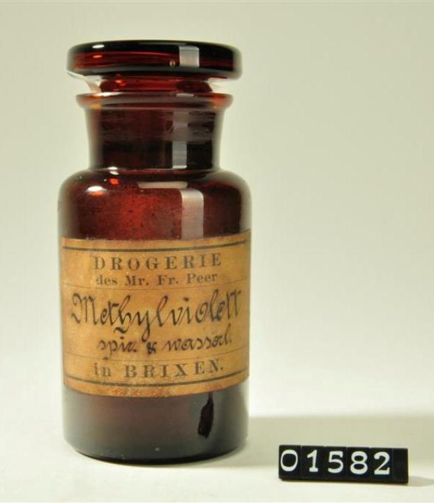 Rundes, dunkelbraunes Pulverglas mit Schliffstopfen. Hohlstopfen mit Hefteisenabriss. Ausladender, abgeflachter Mündungsrand. Handschriftlich signiert. Etikett der Drogerie des Mr. Fr. Peer in Brixen.
