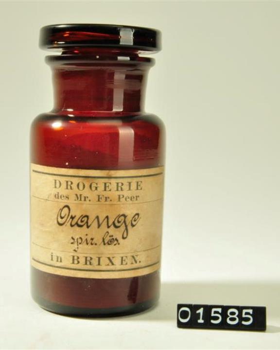 Rundes, braunes Pulverglas mit Schliffstopfen. Hohlstopfen mit Hefteisenabriss. Ausladender, abgeflachter Mündungsrand. Handschriftlich signiert. Etikett der Drogerie des Mr. Fr. Peer in Brixen.