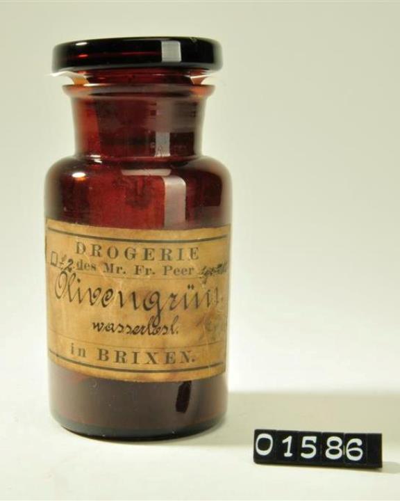 Rundes, braunes Pulverglas mit Schliffstopfen. Hohlstopfen mit Hefteisenabriss. Ausladender, abgeflachter Mündungsrand. Handschriftlich signiert. Etikett der Drogerie des Mr. Fr. Peer in Brixen.