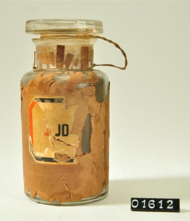Rundes, farbloses Pulverglas mit Schliffstopfen. Hohlstopfen mit Hefteisenabriss. und mit Hanffaden am Pulverglas befestigt. Ausladender Mündungsrand. Schwarz signiert