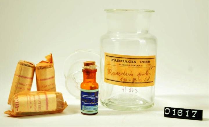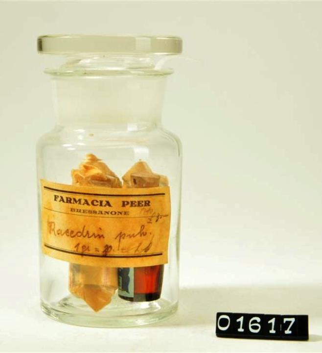 Rundes, farbloses Pulverglas mit Schliffstopfen. Hohlstopfen mit Hefteisenabriss. Ausladender, flacher Mündungsrand. Handschriftlich signiert. Etikett der farmacia Peer, Bressanone.