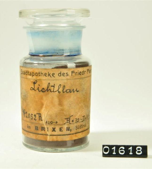 Rundes, farbloses Pulverglas mit Schliffstopfen. Hohlstopfen mit Hefteisenabriss. Ausladender, flacher Mündungsrand. Handschriftlich signiert. Etikett der Stadtapotheke des Friedr Peer in Brixen, Südtirol.