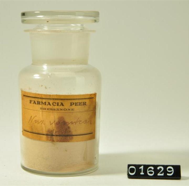 Rundes, farbloses Pulverglas mit Schliffstopfen. Hohlstopfen mit Hefteisenabriss. Ausladender, flacher Mündungsrand. Handschriftlich signiert. Etikett der Farmacia Peer, Bressanone.