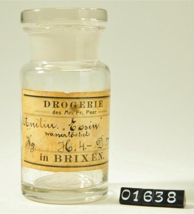 Rundes, farbloses Pulverglas mit Schliffstopfen (Massivstopfen). Ausladender, flacher Mündungsrand. Handschriftlich signiert. Etikett der Drogerie des Mr. Fr. Peer in Brixen.
