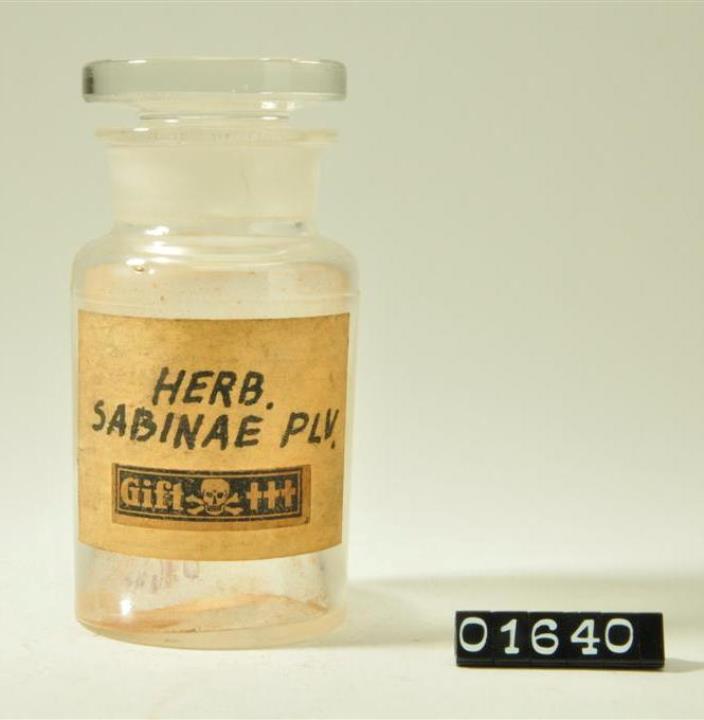 Rundes, farbloses Pulverglas mit Schliffstopfen (Massivstopfen). Ausladender Mündungsrand. Handschriftlich mit Druckbuchstaben in schwarzer Tinte signiert von Toni Kerer. Darunter Giftwarnschild, weiße Schrift auf schwarzem Grund.