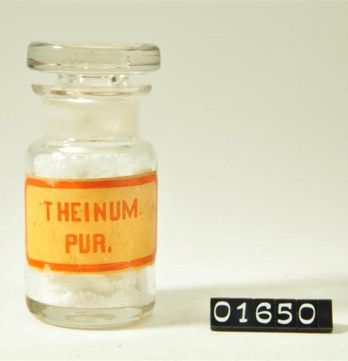Rundes, farbloses Pulverglas mit Schliffstopfen. Hohlstopfen mit Hefteisenabriss. Ausladender Mündungsrand. Mit Signierapparat bedrucktes und mit Schilderlack überzogenes Papierschild, achteckig, mit rotem Rand und roter Schrift auf ehemals weißem Grund.