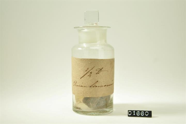 Rundes, farbloses Pulverglas mit Schliffstopfen mit quadratischem Griff. Boden und Hohlstopfen mit Hefteisenabriss. Ausladender Mündungsrand. Handschriftlich mit schwarzer Tinte auf grauem Papier signiert.
