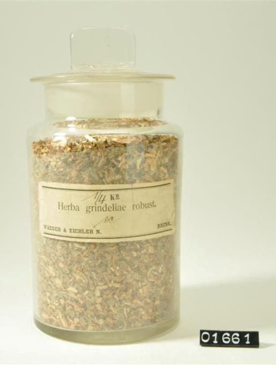 Rundes, farbloses Pulverglas mit Schliffstopfen mit rechteckigem Griff. Boden und Hohlstopfen mit Hefteisenabriss. Ausladender Mündungsrand. Signiert. Etikett der Firma Waeger & Eichler N aus Bruna.