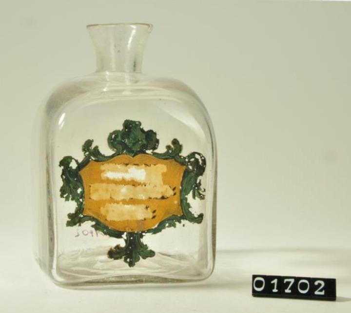 Vierkantflasche aus farblosem Glas, leicht hochgestochener Boden mit Hefteisenabriss, bis auf die Schulter überstochen. Kurzer, leicht trichterförmig sich öffnender Hals. Geschwungenes goldenes Schild mit umgebendem grünem Blattdekor in Kaltmalerei.