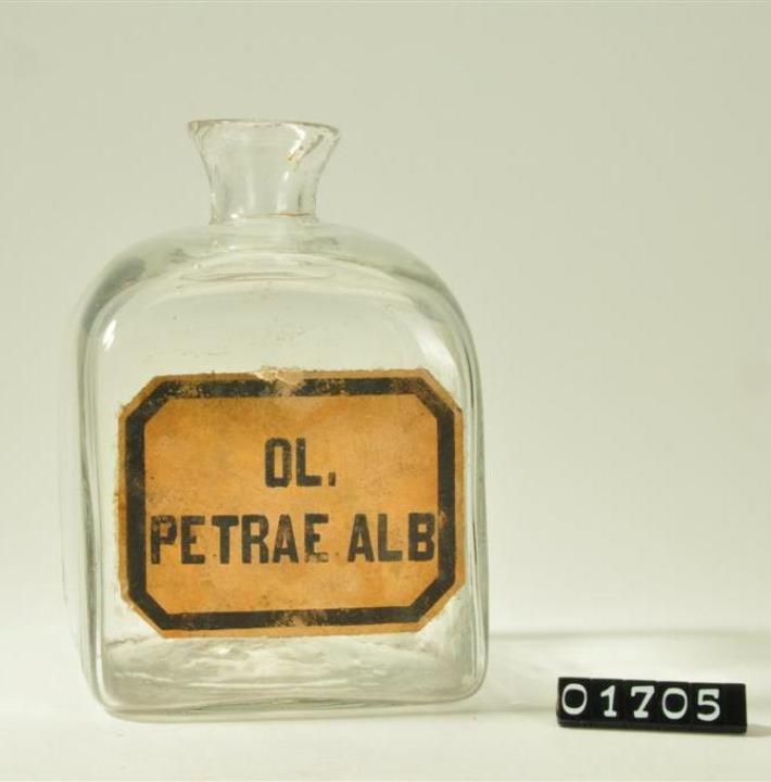 Vierkantflasche aus farblosem Glas, leicht hochgestochener Boden mit Hefteisenabriss, bis auf die Schulter überstochen. Kurzer, leicht trichterförmig sich öffnender Hals. Schwarz signiert