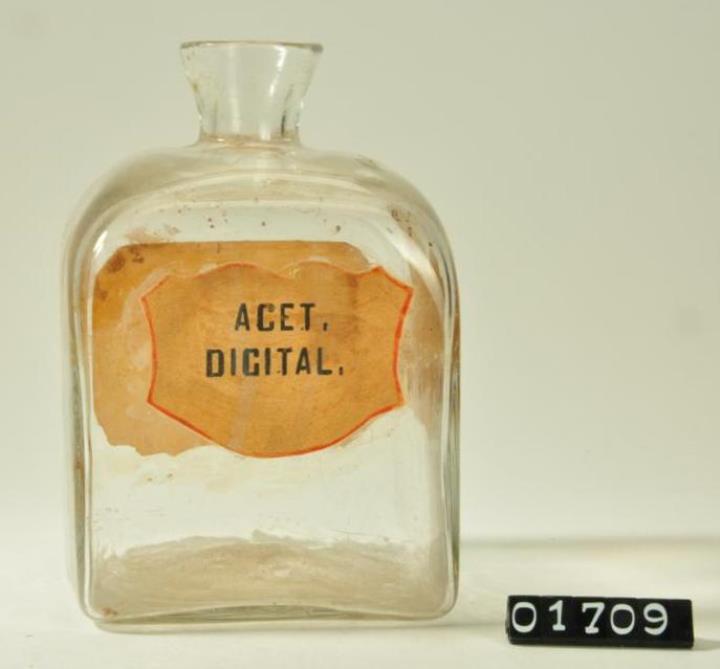 Vierkantflasche aus farblosem Glas, leicht hochgestochener Boden mit Hefteisenabriss, bis auf die Schulter überstochen. Kurzer, leicht trichterförmig sich öffnender Hals. Schwarz signiert
