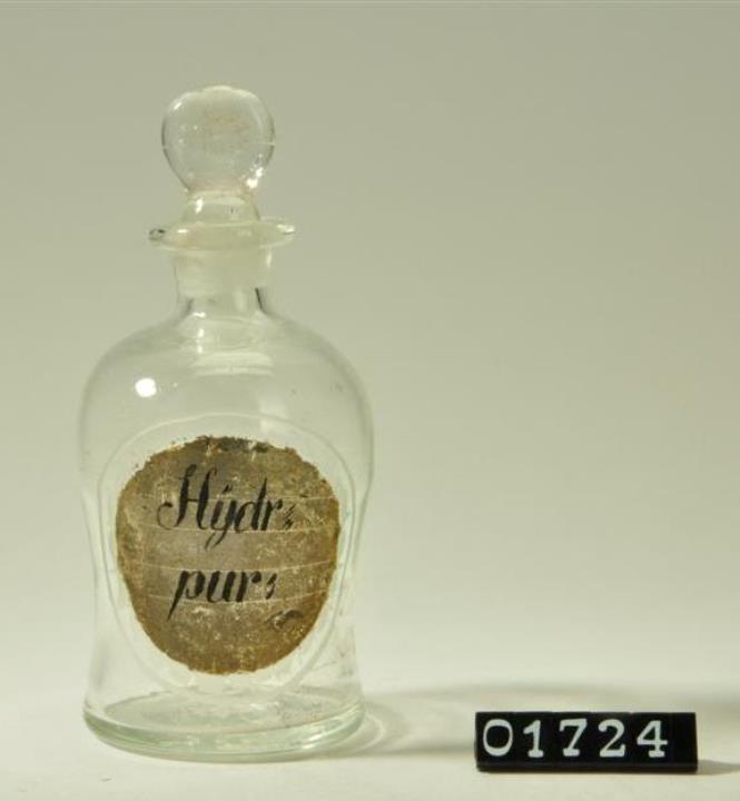 Standflasche aus farblosem Glas mit bauchigem Oberteil und Schliffstopfen mit scheibenförmigem Griff (Massivstopfen). Hefteisenabriss, Mündungsrand mit wulstartiger Verdickung. Ovales Goldschild in Kaltmalerei mit weißlich mattem Dekorrahmen. Schwarz signiert