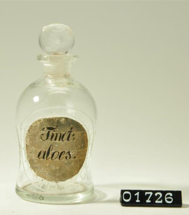 Standflasche aus farblosem Glas mit bauchigem Oberteil und Schliffstopfen mit scheibenförmigem Griff (Massivstopfen). Hefteisenabriss, Mündungsrand mit wulstartiger Verdickung. Ovales Goldschild in Kaltmalerei mit weißlich mattem Dekorrahmen. Schwarz signiert