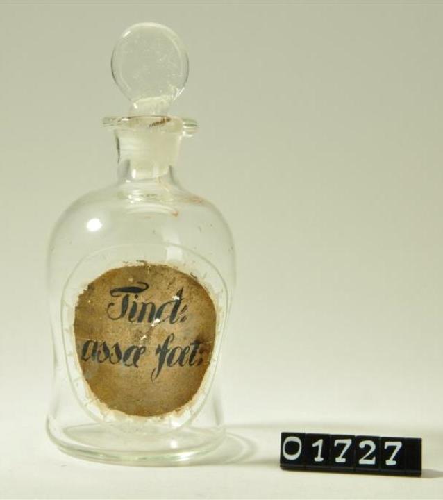 Standflasche aus farblosem Glas mit bauchigem Oberteil und Schliffstopfen mit scheibenförmigem Griff (Massivstopfen). Hefteisenabriss, Mündungsrand mit wulstartiger Verdickung. Ovales Goldschild in Kaltmalerei mit weißlich mattem Dekorrahmen. Schwarz signiert