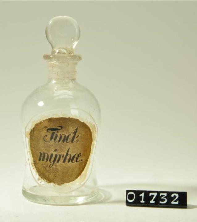 Standflasche aus farblosem Glas mit bauchigem Oberteil und Schliffstopfen mit scheibenförmigem Griff (Massivstopfen). Hefteisenabriss, Mündungsrand mit wulstartiger Verdickung. Ovales Goldschild in Kaltmalerei mit weißlich mattem Dekorrahmen. Schwarz signiert