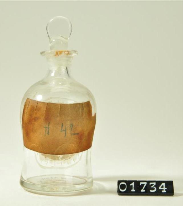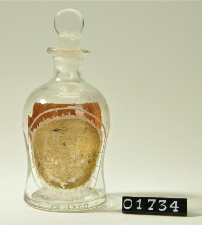 Standflasche aus farblosem Glas mit bauchigem Oberteil und Schliffstopfen mit scheibenförmigem Griff (Massivstopfen). Hefteisenabriss, Mündungsrand mit wulstartiger Verdickung. Ovales Goldschild in Kaltmalerei mit weißlich mattem Dekorrahmen. Schwarz signiert
