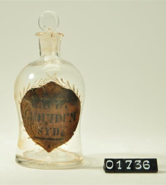 Standflasche aus farblosem Glas mit bauchigem Oberteil und Schliffstopfen mit scheibenförmigem Griff (Massivstopfen). Hefteisenabriss, Mündungsrand mit wulstartiger Verdickung. Zitronenförmiges Papierschild mit weißlich mattem, aufsteigendem Blätterzweig umrahmt. Schwarz signiert