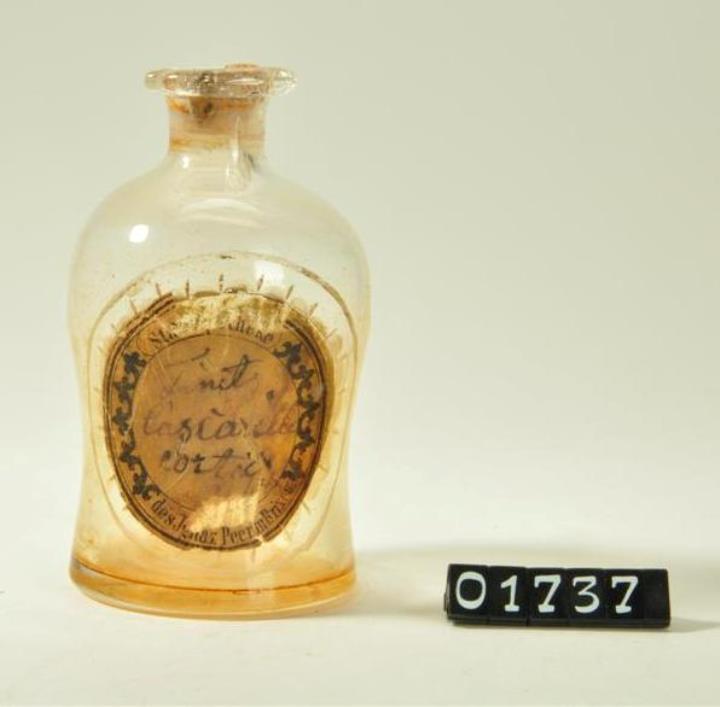 Standflasche aus farblosem Glas mit bauchigem Oberteil und Stopfen. Hefteisenabriss, Mündungsrand mit wulstartiger Verdickung. Ovales Papierschild mit weißlich mattem Dekorrahmen. Schwarz signiert