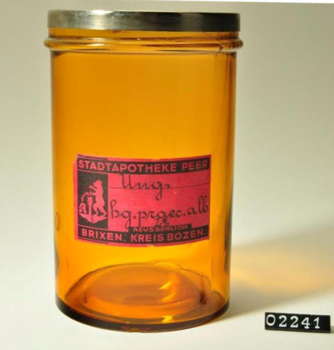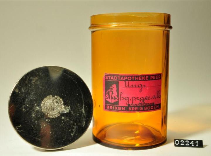 Zylindrisches, braunes Glasgefäß (Salbentopf), Stülpdeckel aus Blech mit Firmenprägung. Seitliche Naht. Rotes Etikett der Stadtapotheke Peer. Enthielt weiße Quecksilberpräzipitatsalbe.