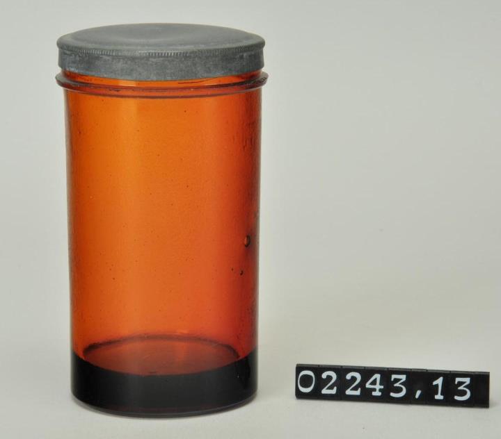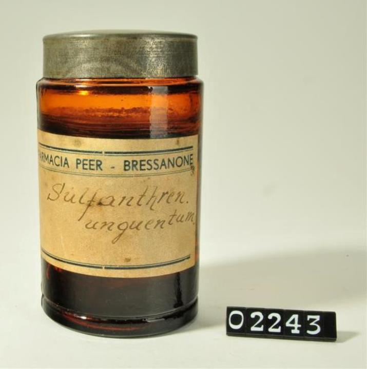 Zylindrisches, braunes Glasgefäß (Salbentopf) mit Stülpdeckel aus Blech. Seitliche Naht. Weißes handbeschriebenes Etikett der Farmacia Peer, Bressanone.