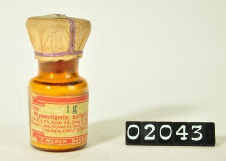 Rundes, braunes Pulverglas mit Schliffstopfen und Tektur. Mit Papiersiegel und Faden original verschlossen. Etikett der Firma Merck.
