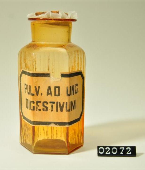 Im Grundriss sechseckiges, hellbraunes Pulverglas mit Korkstopfen. Drei Seitenwänden vertikal geriffelt. Ausladender flacher Mündungsrand. Schwarz signiert