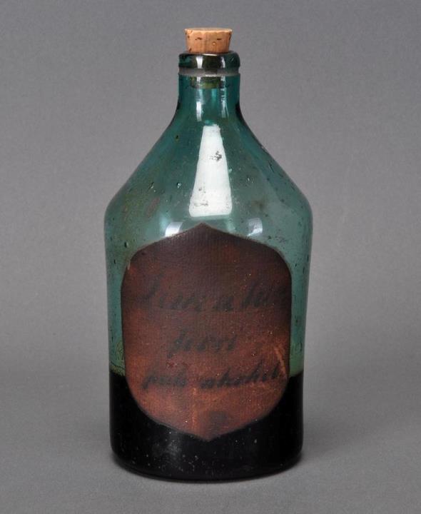 Runde, grüne Enghalsflasche mit steiler Schulter und Korkstopfen. Hochgestochener Boden mit unregelmäßigem Hefteisenabriss. Rille unter dem dicken Mündungsrand. Schwarz signiert. Enthält Apfelsaure Eisentinktur.
