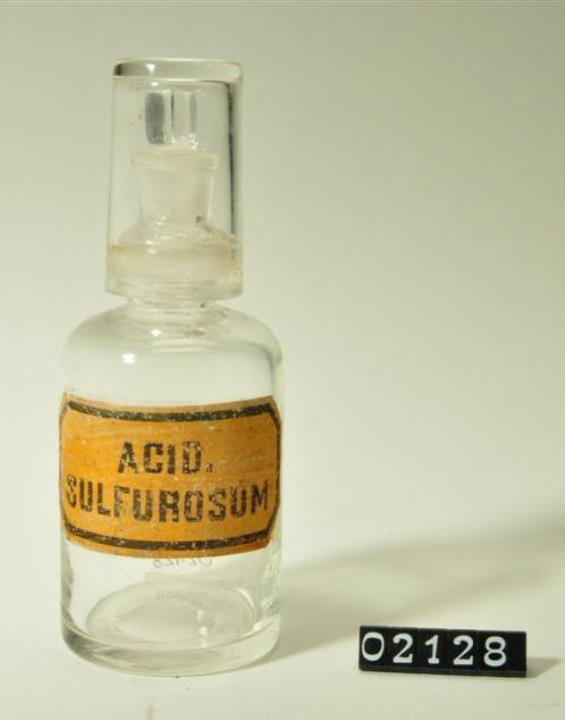 Runde, farblose Enghalsflasche mit eingeschliffenem Griffstopfen (Massivstopfen) und aufgeschliffener Glaskappe. Abgeschliffener Hefteisenabriss. Schwarz signiert